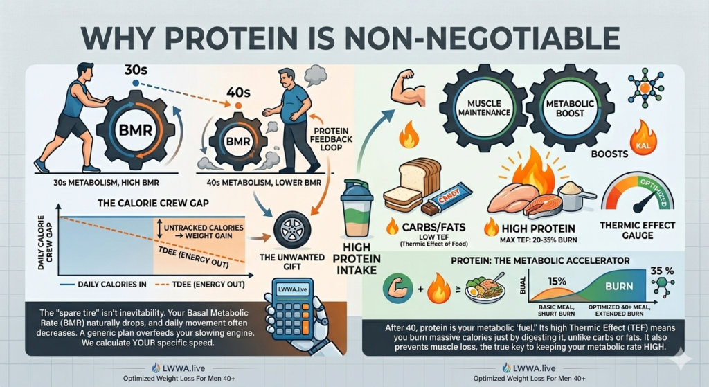 For the 40+ man, protein isn’t just for bodybuilders; it’s for metabolic health. Our tool suggests a higher protein split (30-35%) because protein has a higher Thermic Effect of Food (TEF), meaning your body burns more calories just digesting it compared to fats or carbs.