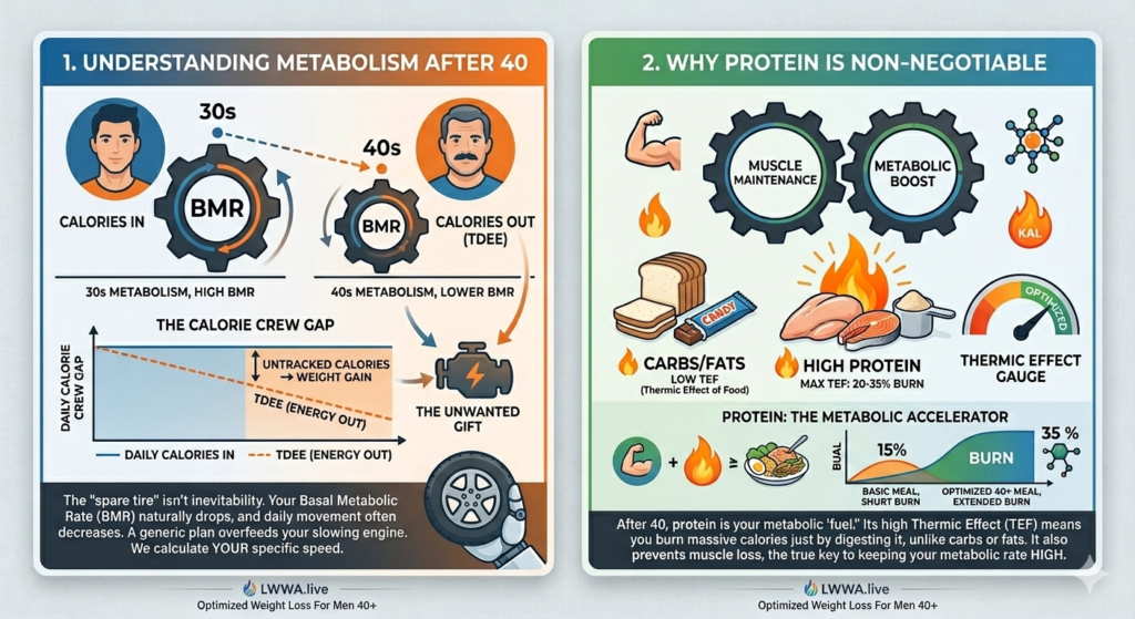 As men cross the threshold of 40, the biological “math” of weight loss changes. It is no longer as simple as “calories in vs. calories out.” Research from the Mayo Clinic and clinical studies on Anabolic Resistance show that two major factors take over: